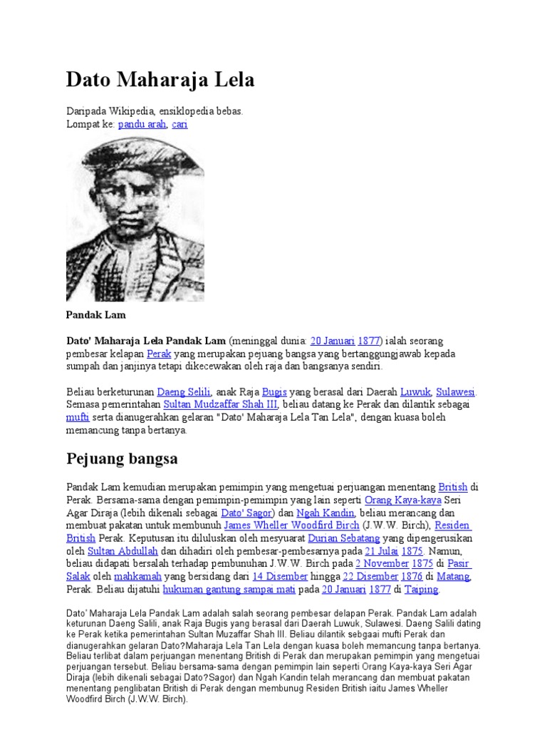 Pengenalan Dato Maharaja Lela / Dato maharaja lela (died on 20 january 1877) was a malay nationalist from perak a descendant of daeng salili, pandak limo was the son of a bugis king from luwuk district, sulawesi.during the reign of sultan muzaffar shah iii, he came to perak and was appointed mufti and was awarded the title dato.. Beliau tidak mahu mengotorkan dirinya menjadi pencacai british, sebaliknya dengan penuh strategi dan umpamanya mempertahankan sistem tradisional di perak yang. Dato maharaja lela adalah satu gelaran yang cukup tidak asing dalam lembaran sejarah negeri perak yang mana ia bukanlah nama kepada individu dato maharaja lela adalah merupakan poisisi yang paling tinggi di kalangan orang besar lapan. Dato' maharaja lela ialah orang besar berlapan perak dan penghulu di pasir salak. Pandak lam adalah keturunan daeng salili, anak raja bugis yang berasal dari daerah luwuk, sulawesi. Pada november 1874 perak menerima residen british iaitu j.w.w.birch hasil daripada perjanjian pangkor.