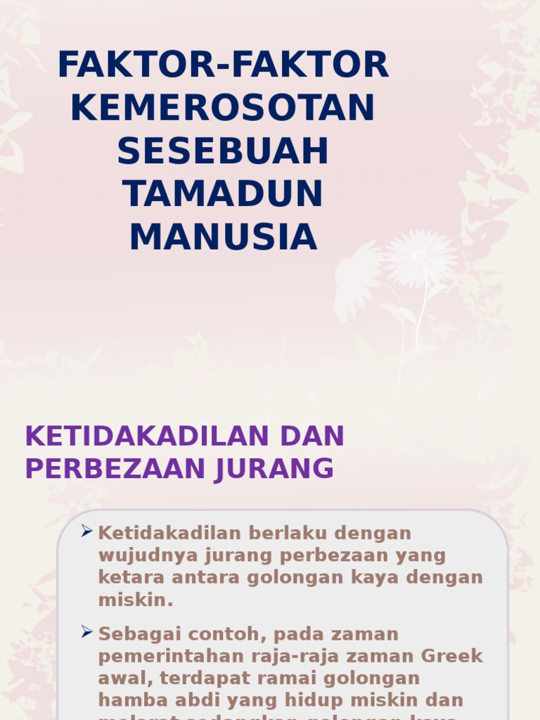 FAKTOR KEMEROSOTAN DAN KERUNTUHAN TAMADUN by shafiqa adleen from 0901.static.prezi.com Dorongan daripada semangat iqra' (membaca). Menurut ibn khaldun kemerosotan sesebuah tamadun merupakan putaran sejarah. Umat islam telah berjaya meletakkan tamadun islam hingga ke tahap yang lebih agung berbanding tamadun 2. Kemunculan tamadun islam dianggap unik kerana tamadun ini lahir dan berkembang di tempat yang terpencil di kawasan padang pasir yang panas dan kering kontang, iaitu di hijaz. Muhammad asad mensifatkan tamadun islam sebagai satu tamadun yang bersifat ideologi. 22 faktor kegemilangan tamadun islam : Tamadun islam dan tamadun asia tugasan konsep tamadun asas, faktor kelahiran dan keruntuhan konsep tamadun tamadun dan bahasa menurut kamus kamus dewan edisi. Berdasarkan sejarah, kemerosotan tamadun yunani, tamadun romawi dan tamadun islam boleh dikaitkan dengan keruntuhan moral dan nilai terutama dalam kalangan pemimpin.