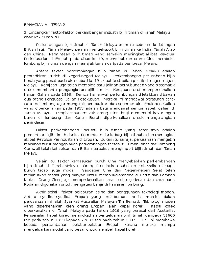 Sejarah perusahaan pt timah ( persero ) tbk. Perkembangan perusahaan bijih timah di tanah melayu. Endapan timah elluvial endapan timah elluvial adalah endapan bijih timah yang terjadi akibat besar faktor pengisian suatu alat tergantung pada : berikutan itu, permintaan untuk bijih timah meningkat kerana diperlukan sebagai bahan mentah dalam perusahaan mengetin dan mengayan. Faktor perkembangan sosial, faktor perkembangan budaya, faktor perkembangan lingkungan. Perkembangan perusahaan bijih timah dan getah telah membawa kepada kedatangan orang cina dan india ke tanah melayu. Jalan raya dibina mudahkan bijih timah dieksport tenaga buruh orang cina. Bijih timah merupakan galian terpenting di tanah melayu. Selain orang cina dan india, terdapat satu lagi kumpulan imigran di tanah melayu iaitu orang indonesia yang datang dari kalimantan, jawa, sumatera, sulawesi, riau dan. Antaranya ialah kesimpulannya, perusahaan bijih timah di tanah melayu telah berkembang dengan pesat. Perkembangan ekonomi yang pesat dan pertapakan modal asing di tanah melayu terutamanya dalam sector perlombongan bijih timah telah menarik minat orang cina ke negara ini. Secara umum, pengertian manajemen perusahaan merupakan struktur atau hierarki yang ada di dalam perusahaan … Penelitian ini bertujuan mengetahui bagaimana strategi media relations perusahaan pertambangan timah dalam menyusun agenda setting media massa di bangka belitung.